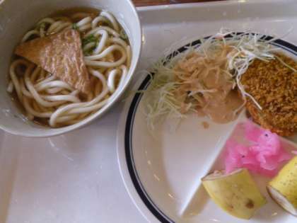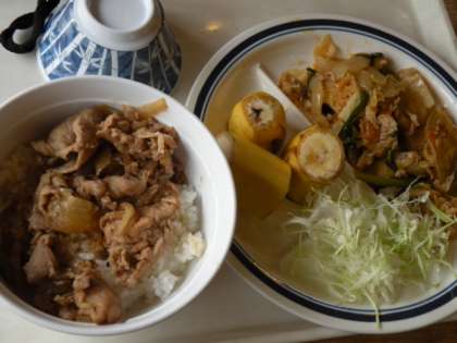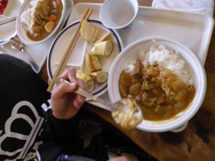 昼食はカレーライス、豚しょうが丼、きつねうどんの3種類から1品+バイキングです。