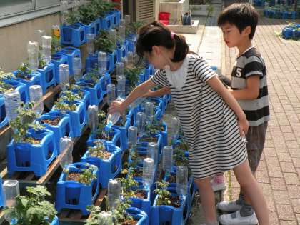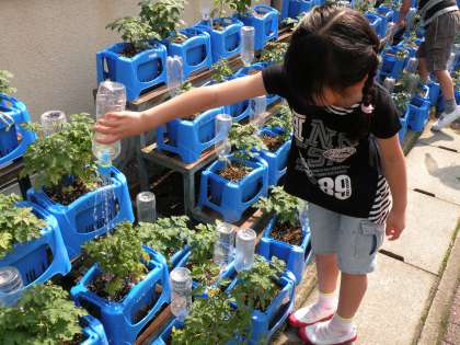 2年生は中庭でミニトマトを栽培しています。