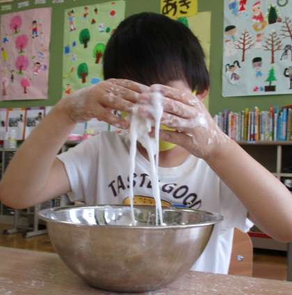 登校日の日に,片栗粉を使ってダイラタンシーをしました。最初は片栗粉のふわふわする触感を楽しんでいました。その後,水を足していくと少しずつトロトロしてきました。指で強く握ると固まりますが,力を抜くとトローッと指の隙間から抜けていくのが面白かったようで,何度も何度も触って遊びました。