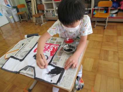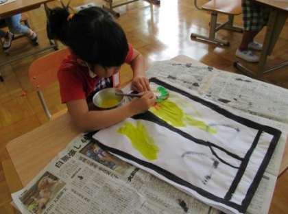 自分の好きな柄をパスで描いた後,絵の具で色を塗りました。