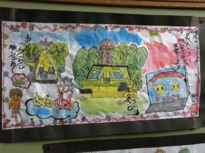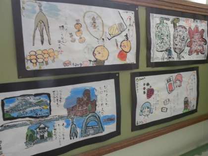 5月に行った修学旅行。その思い出を絵と言葉で描いた作品が出来上がりました。教室や階段踊り場に掲示しています。