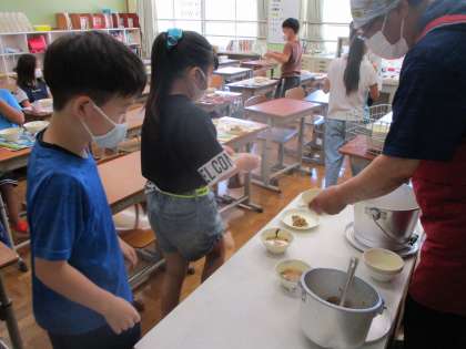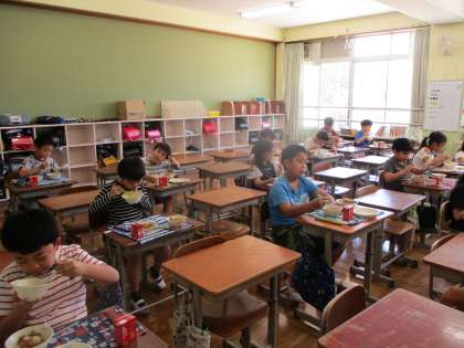 本当に久しぶりの給食でした。ごはんやおかずは担任の先生やお手伝いの先生たちで入れて,一人一人が取りに来ます。給食にもたくさん決まりがありますが,しっかり守って給食を食べました。