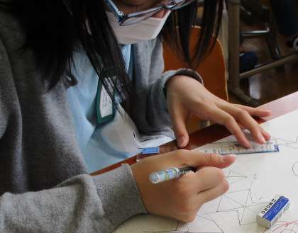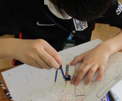 家庭学習でも頑張っていた点対称の作図。授業の中でもコンパスや定規を使ってがんばっています。