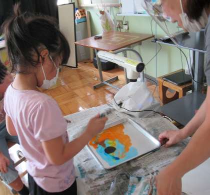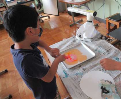 それぞれが自分の好きな色の絵具を3色水の上に垂らして,割りばしで線を描きました。