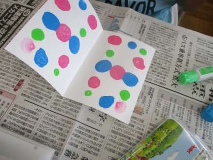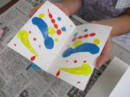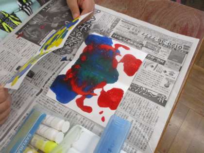半分に折った画用紙の片側に絵具をつけて半分に折ります。上からこすって開いてみると…