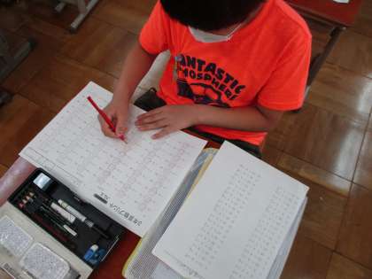 毎日算数プリントの宿題に取り組んでいます。答え合わせをみんなでしています。九九はもちろんのこと,わり算の計算ミスもなく,しっかり学べている3年生です。