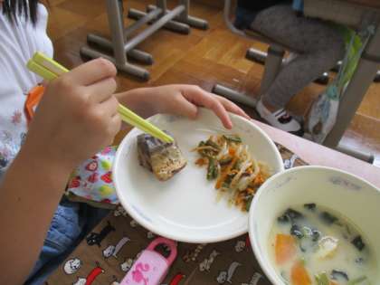 難しいと感じる子どももいたようですが,お魚の骨と格闘しながら,上手に食べている子がたくさんいました。