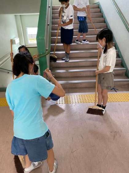 そうじもほうきやモップしか使うことができませんが,教室やろうか,階段をがんばってそうじする姿があちこちで見られました。
