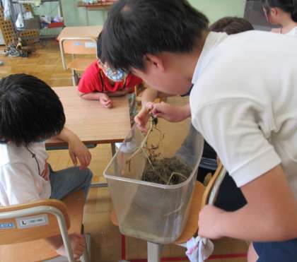 わかばの教室でみんなでカブトムシを観察しました。