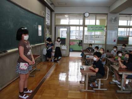 毎朝,朝の会をしています。日直の司会進行で進めています。スピーチタイムもあります。スピーチの後は,質問や感想も受けています。