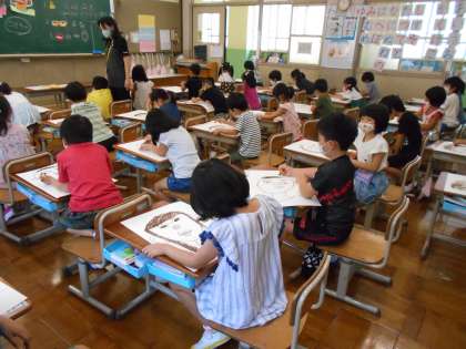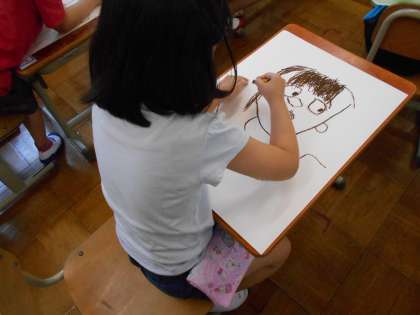 今日の図画工作科の時間に,「ぼくのかお わたしのかお」として,自画像の線描をしました。自分の顔のパーツを実際に触り,どこについているのかを確認し,ひとつひとつ丁寧に描いていきました。