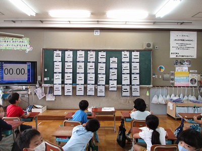 みんなで初めて書いた習字の文字「二」を鑑賞しました。力強い文字,お手本のような美しい文字などたくさんの感想が出ました。