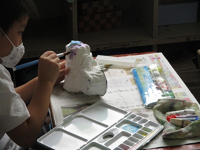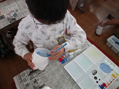 変身させた空き容器に「色」を付けました。3原色を使用し,お気に入りの色を作ってぬりました。