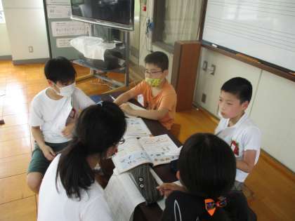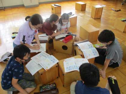 リズムに合わせて,グループでパートと楽器を相談して決めています。
