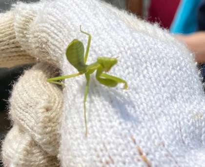 背中にカマキリが乗っていました。