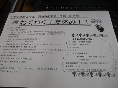 宿題は進んでいますか?24日月曜日から学校開始ですね。24日には,国語の時間に「漢字テスト」の予定をしています。1学期に学んだ漢字をしっかり覚えてきましょうね。