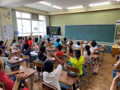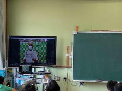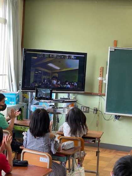 今回は初のオンライン始業式。校長先生に手を振って,お話を聞きました。また,6年生のがんんばったこともしっかりと聴いていました。