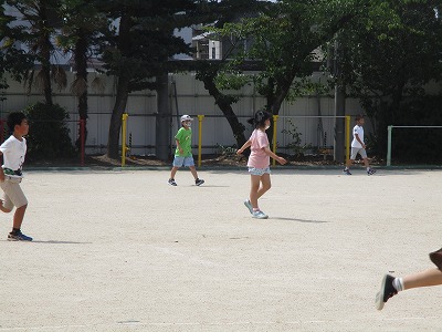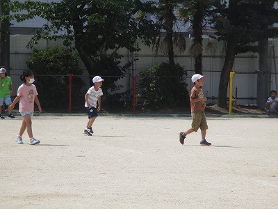 暑さにも負けずに全員で鬼ごっこ。ここでも元気に走る子どもたちでした。暑いので,マスク脱着には十分気を付けて。水分補給もしっかりして。密にならないように遊びましょうね。