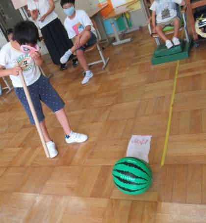 みんなで夏らしいことをしようということで,「すいか割り」をしました。