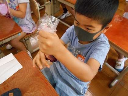 今日の生活科の時間に,あさがおの花がらを使って色水あそびをしました。