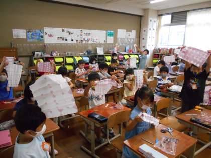 もみだして作った色水に,三角や四角に折った半紙を浸し,そうっと広げてみました。