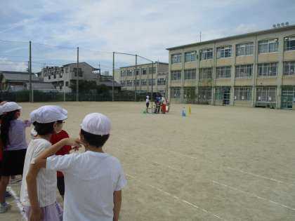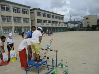 水の量がそれぞれ違うペットボトルロケットを用意し,空気を入れた時に飛ぶ距離を予想しました。