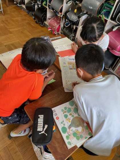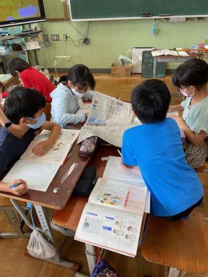 新聞のとくちょうを,本物の新聞を見ながら,グループで考えました。