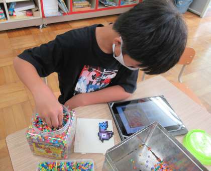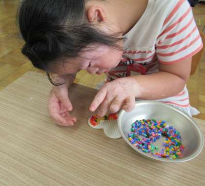 指先の力を使って,自分の好きな色のビーズを見つけたり選んだりして,それぞれ思い思いの形を作っていました。見本の写真を見ながら,一つ一つ丁寧に作っている人もいれば,「食べ物を作る」とテーマを決めて取り組んでいる人もいました。