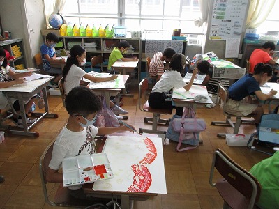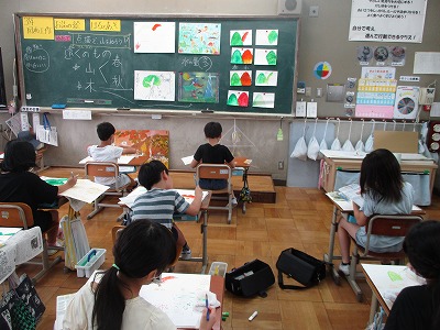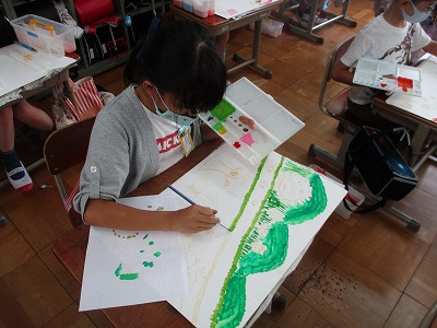 下描きに絵の具を使って「彩色」しました。今日は「山」と「木」みな集中して取り組んでいました。出来上がりが楽しみですね。