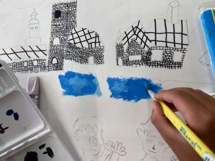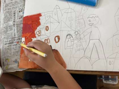 下絵ができたので,場面の様子がよくわかるように少しずつ色を塗っていきます。