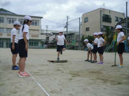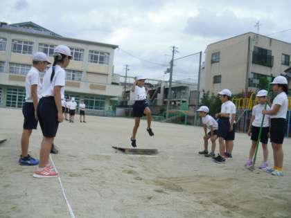 体育で幅跳びをしました!練習の成果が出て,記録がどんどん延びてきている人が増えました。最高記録は3メートル越えでした(^▽^)/