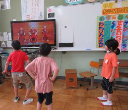 休み時間に好きなダンスを踊っています。手をぐるぐる回したり,ジャンプをしたり,見本の動きを見ながら楽しそうに体を動かしています。