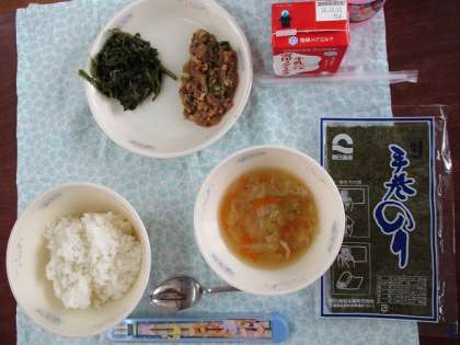 10月2日(金)の献立は,ごはん,牛乳,肉みそ納豆,ほうれん草のおかか煮,キャベツの吉野汁でした。