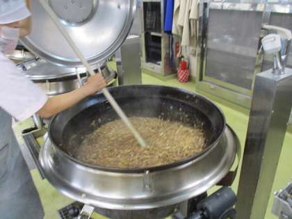 給食では納豆を牛ひき肉やたまねぎ,九条ねぎと一緒に炒め,みそやトウバンジャンで味付けをして,苦手な児童にも食べやすいように工夫しました。