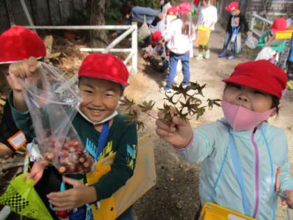 「すごい!こんなにたくさんどんぐりがあった!」「みてみて!顔の形に似ている葉っぱを見つけたよ。」と「落ち葉を踏むとパリパリ鳴ったよ。」と大喜びでした!!