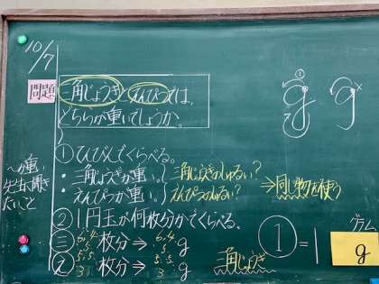 今日の学習で,重さの単位“g”を使うと,重さを数で表すことができることを知りましたね。
