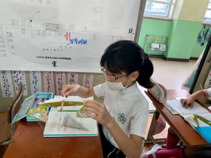 「三角定規の種類が違うからだよ。」,「えんぴつの長さもみんなバラバラやん。」と次々に発言していきました。だったら…“同じ大きさのもので同じ長さのもの”で比べてみることになりました。