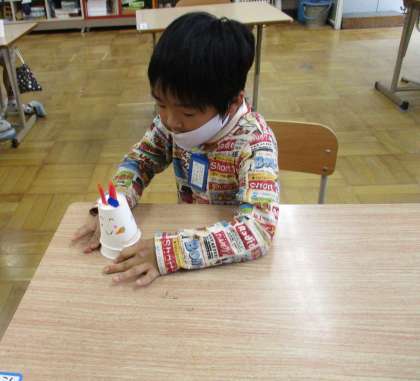 自分たちで紙コップを切って,輪ゴムを付けていました。