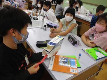 「私たちの体と運動」の単元に入りました。簡単な模型を使って筋肉と骨の仕組みを考えました。