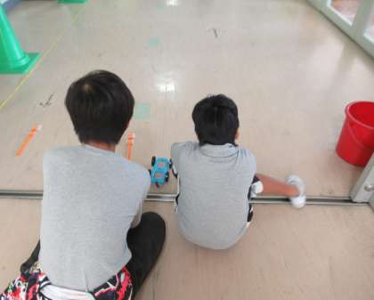ゴムを使った車で実験をしました。何度もしていく内に,発射台の使い方も分かってきている人もいました。