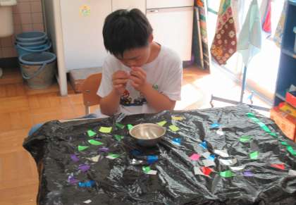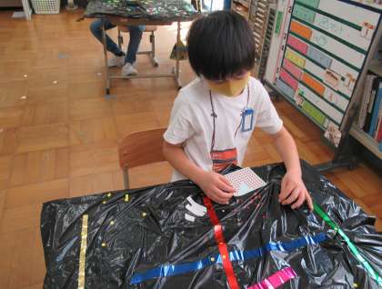 「半分は赤色のテープ,半分は青色のテープ」と決めてビニルテープを貼っている人や,たくさんの色のシールをペタペタ貼って色鮮やかなマントを作っている人もいました。どんなマントができあがるのか楽しみですね。