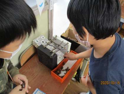 段ボールを坂にしてどんぐりを転がしてみたり,「穴落としゲーム」と名付けて遊んだりととても楽しんでいる様子でした。