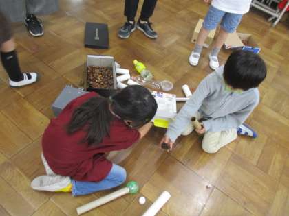 秋見つけで見つけた「おたから」で,楽しく遊べるおもちゃを作っています。