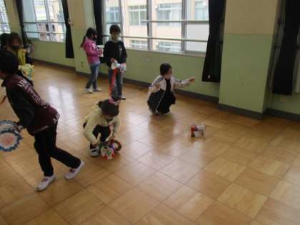 図画工作科「かみざらコロコロ」で作った作品を,広い部屋に行って転がしました。