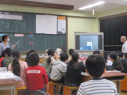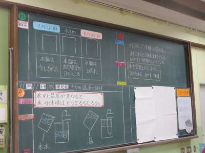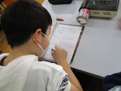 ものの温度と体積の学習をしています。先生の話を聞きしっかりノートをとっています。