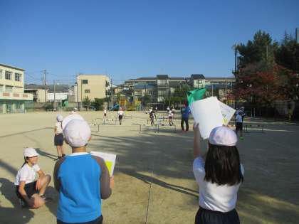 走る人は自分が跳びたいインターバルのカードを見せてから,ハードル係の人がハードルの位置を変えて走ります。