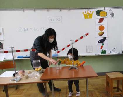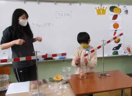 「どっちの方が重いかな?」てんびんを使って重さ比べをしました。