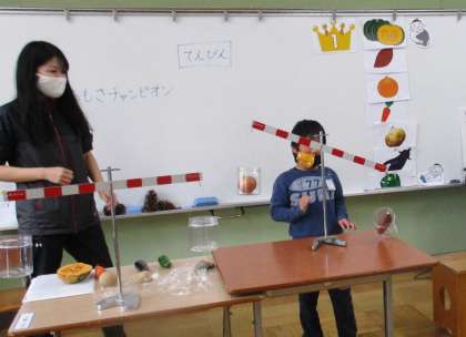 重さが違いすぎるとガタンと傾いてしまうけれど,同じくらいの重さの時はゆらゆらしながら傾きました。「重い」「軽い」が実感できました。