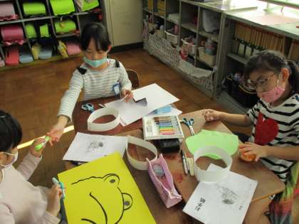 お面を作ったり,想像した台詞をつけたしたりして,何度も練習しています。