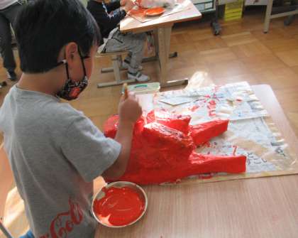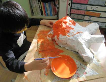 それぞれ様々な色で塗っているので,カラフルで賑やかなお面が出来上がりそうです。